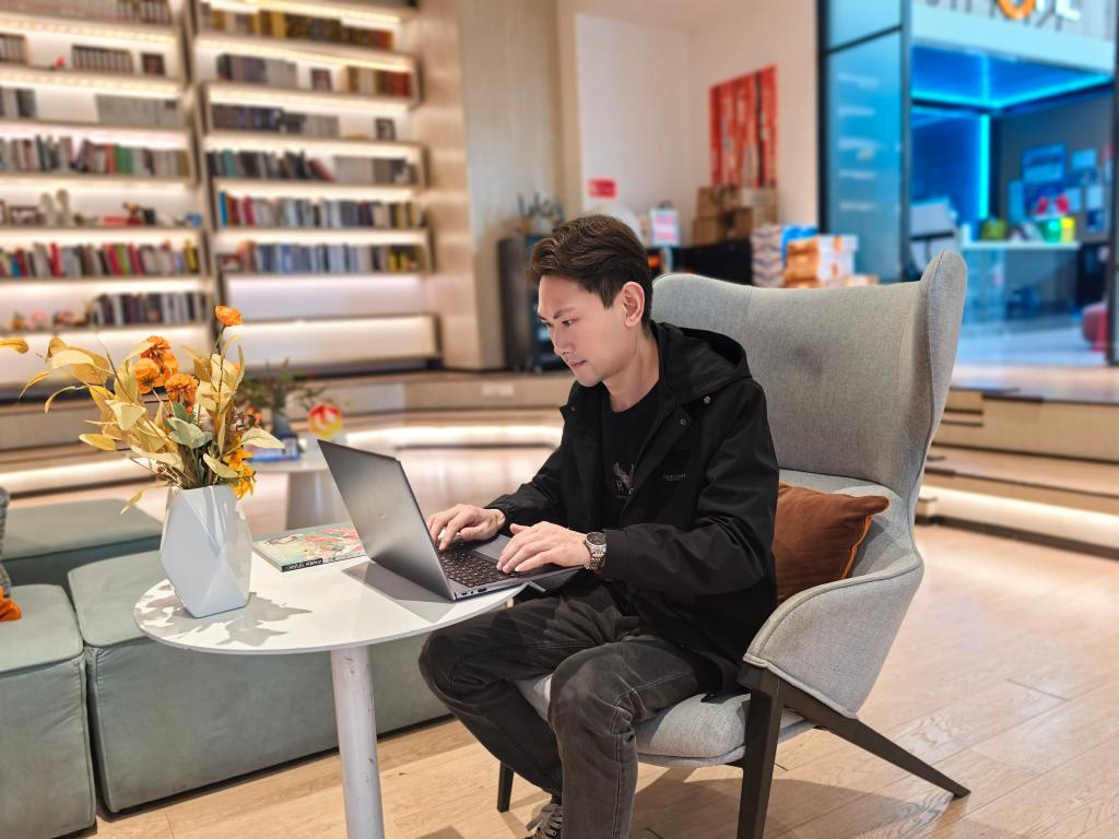 罗玉麒在成都市锦江区青年人才驿站的休息室查询资料。新华社记者李倩薇 摄