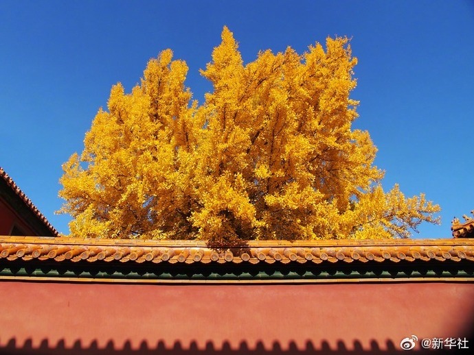 深秋时节,北京故宫博物院金黄的银杏与红墙黄瓦交相辉映,景致如画。