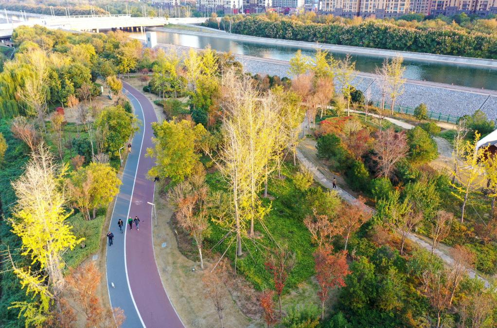 深秋的天河公园一半黄一半绿,市民们在公园里散步、跑步、遛狗、唱歌、唱戏,小朋友们在草地上玩耍嬉戏。