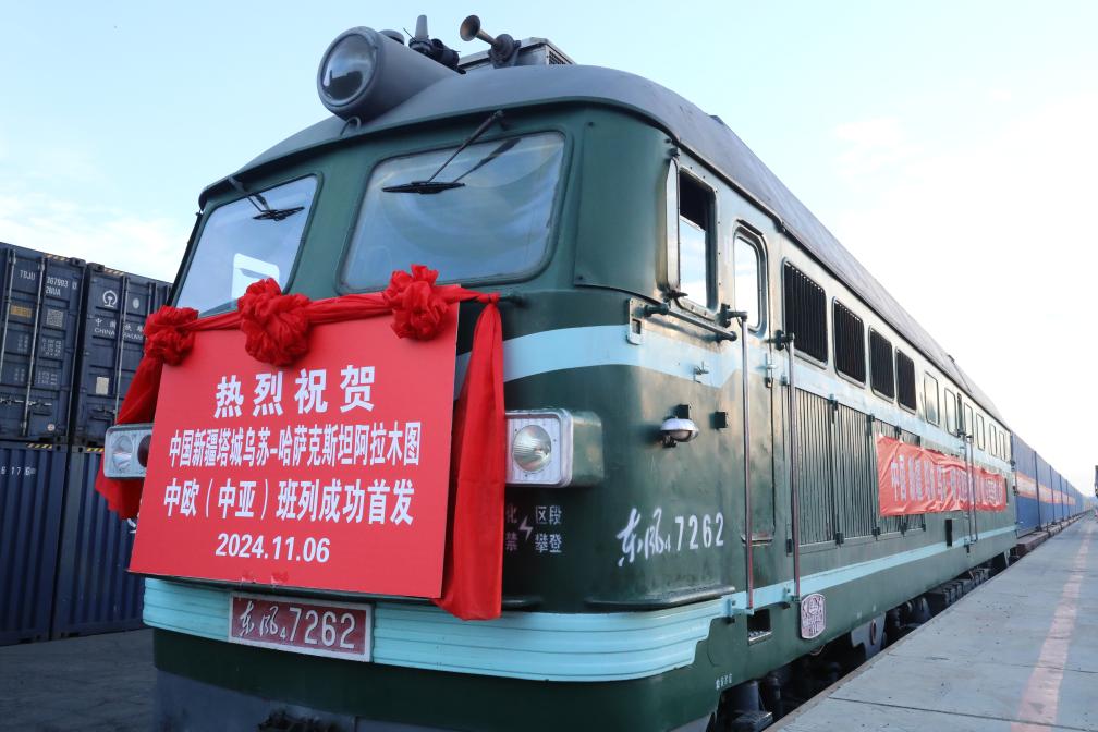 11月6日,在新疆塔城地区乌苏铁路货场,中国新疆塔城乌苏—哈萨克斯坦阿拉木图中欧(中亚)班列首发。新华社记者 初杭 摄