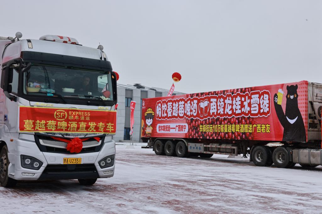 新华社哈尔滨11月5日电(记者戴锦镕)5日清晨,伴随发车仪式上的彩烟升空,三辆运送蔓越莓啤酒的货车从黑龙江省抚远市缓缓驶出,踏上前往广西的8000里旅程。