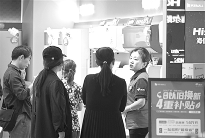 连日来,位于天津市南开区“老城厢”的京东MALL超级体验店门庭若市。商场内,家电家居产品种类多样,“以旧换新 4重补贴”的标语吸引了不少市民前来消费。