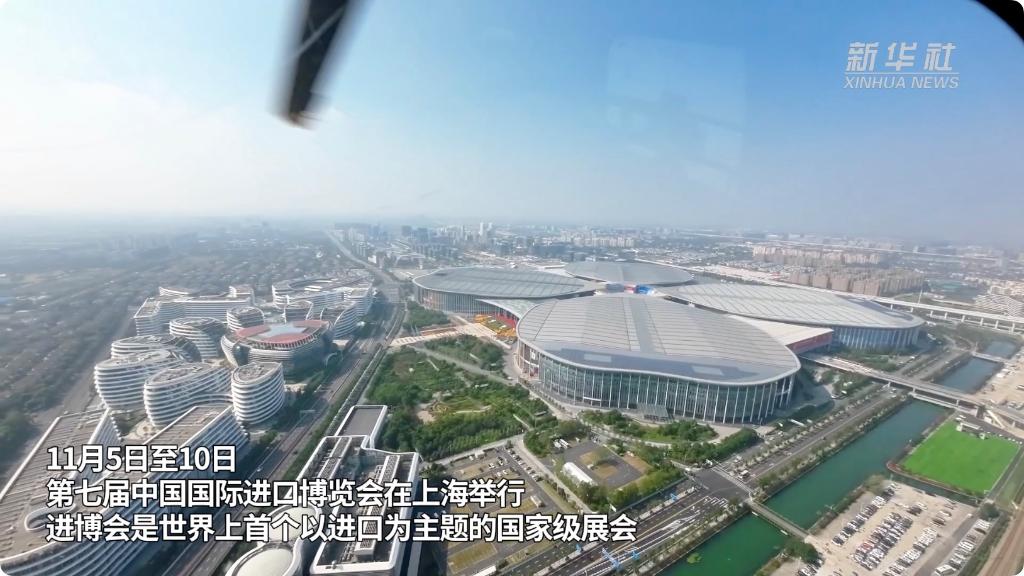 11月5日至10日,第七届中国国际进口博览会在上海举行,进博会的举办地国家会展中心(上海)从空中俯瞰宛若“四叶草”的形状,新华社记者乘坐上海市公安局警务航空队的直升机带你从空中俯瞰这座超大型的展览综合体。