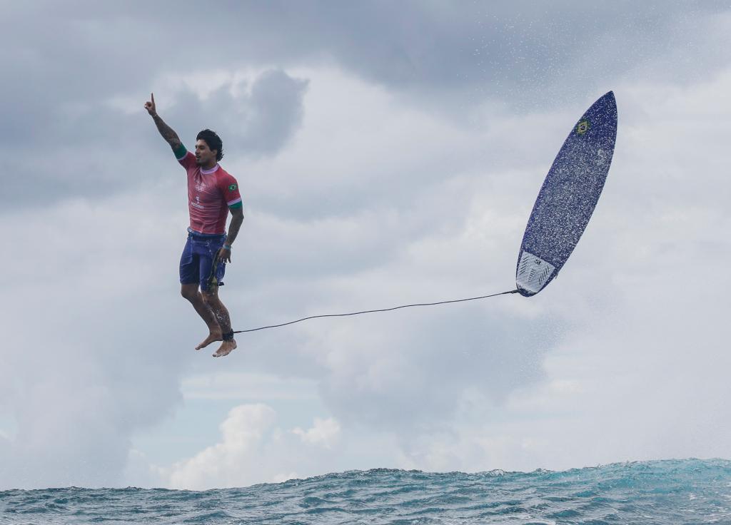 2024年7月29日,巴西选手梅迪纳在比赛中。当日,巴黎奥运会冲浪男子组预赛第三轮比赛在法属波利尼西亚群岛塔希提的提阿胡普举行。新华社记者 马平 摄