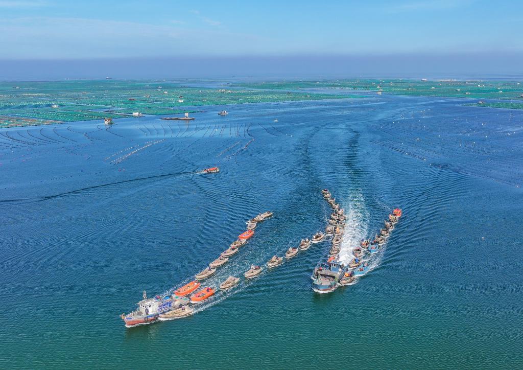 ↑2024年11月5日,在山东省荣成市虎山镇天海湾海洋牧场海参育苗区,养殖船在海上来往穿梭,运送海参苗。(无人机照片)CICPHOTO/王福东 摄