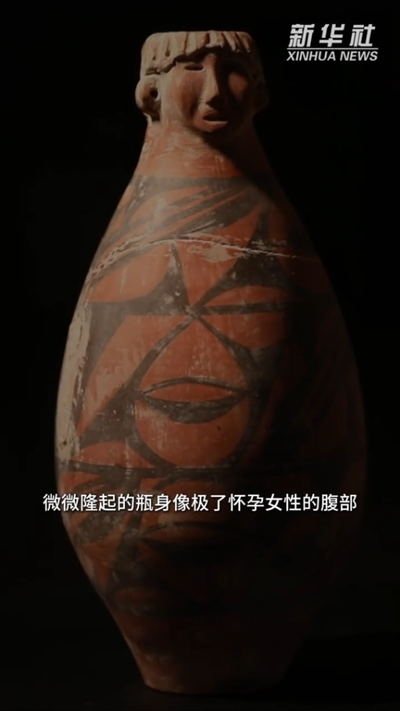微微隆起的瓶身像极了怀孕女性的腹部,象征着生命永生不息的轮回。陶瓶集制陶、彩绘、雕塑艺术于一身,是一件既具实用性又具有艺术性的古代艺术品。