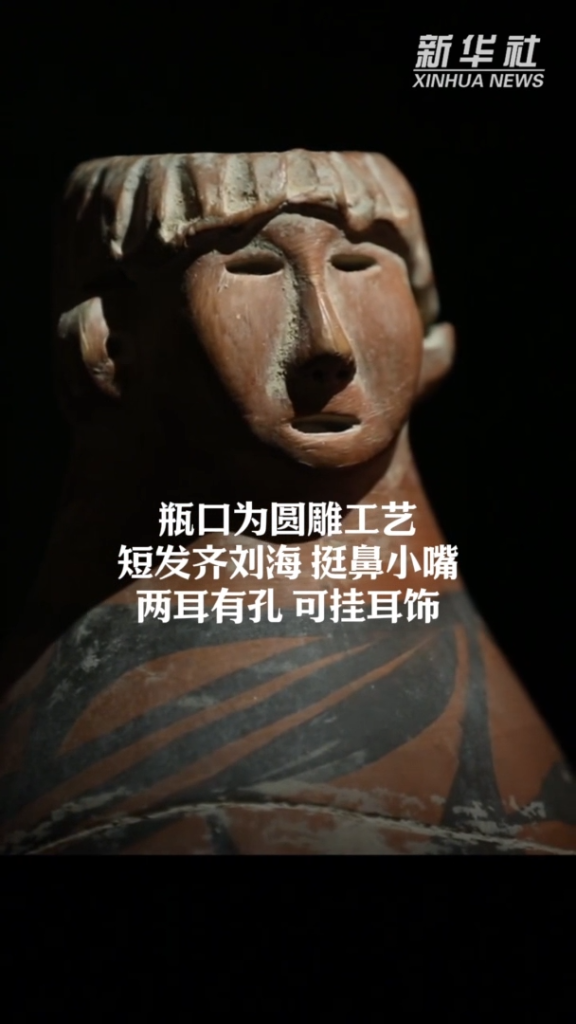 人头形器口彩陶瓶高32.3厘米,口径4厘米,底径6.8厘米,口做圆雕人头像,短发齐刘海,挺鼻小嘴,两耳各有一孔,用于佩戴耳饰,腹以上施淡红色陶衣。瓶身上的图案为变体的鸟纹和茎叶纹,是对当时人们渔猎生活的反映。