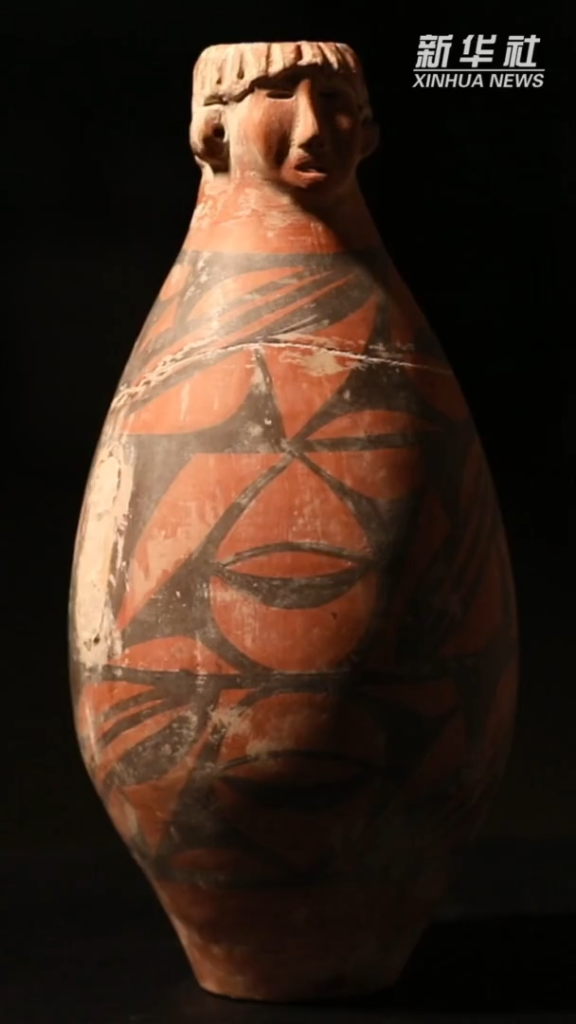 人头形器口彩陶瓶1973年出土于甘肃省秦安县五营镇邵店村,是马家窑文化前期的彩陶。