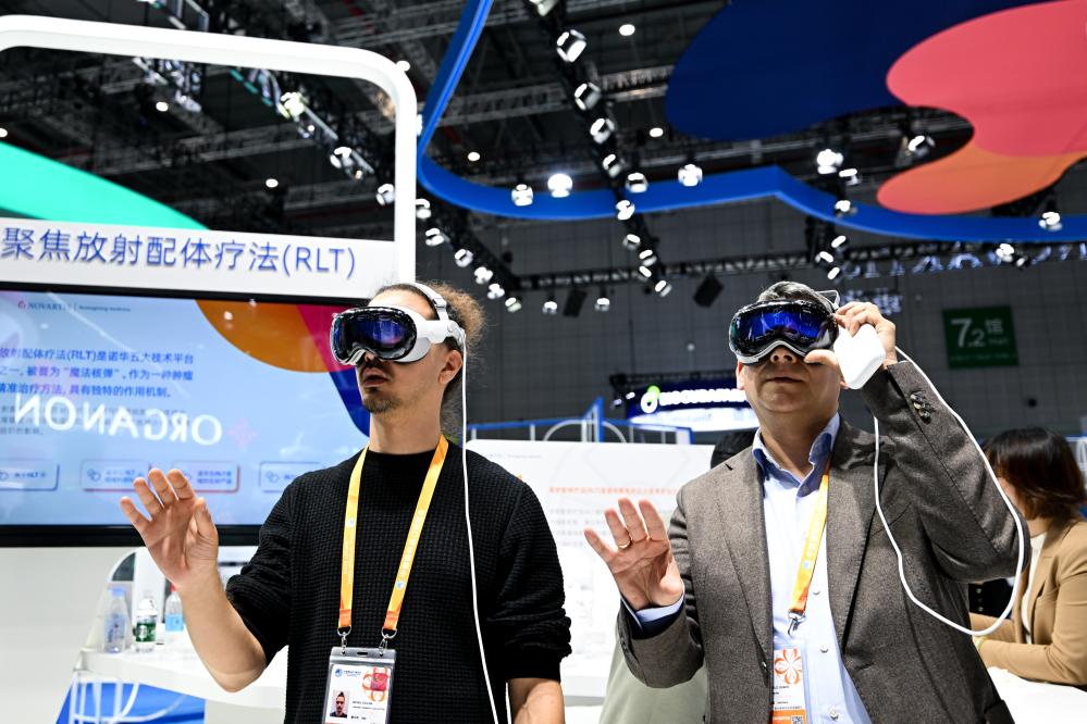 11月8日,在第七届进博会医疗器械及医药保健展区,观众在诺华公司展台利用AR技术了解放射配体疗法的治疗过程。新华社记者辛悦卫摄