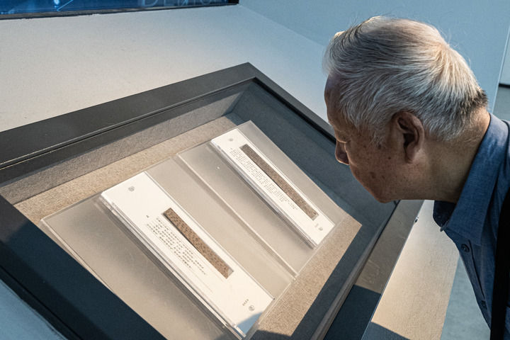 观众在云梦县博物馆参观《黑夫木牍》(复制品)。新华社记者肖艺九 摄