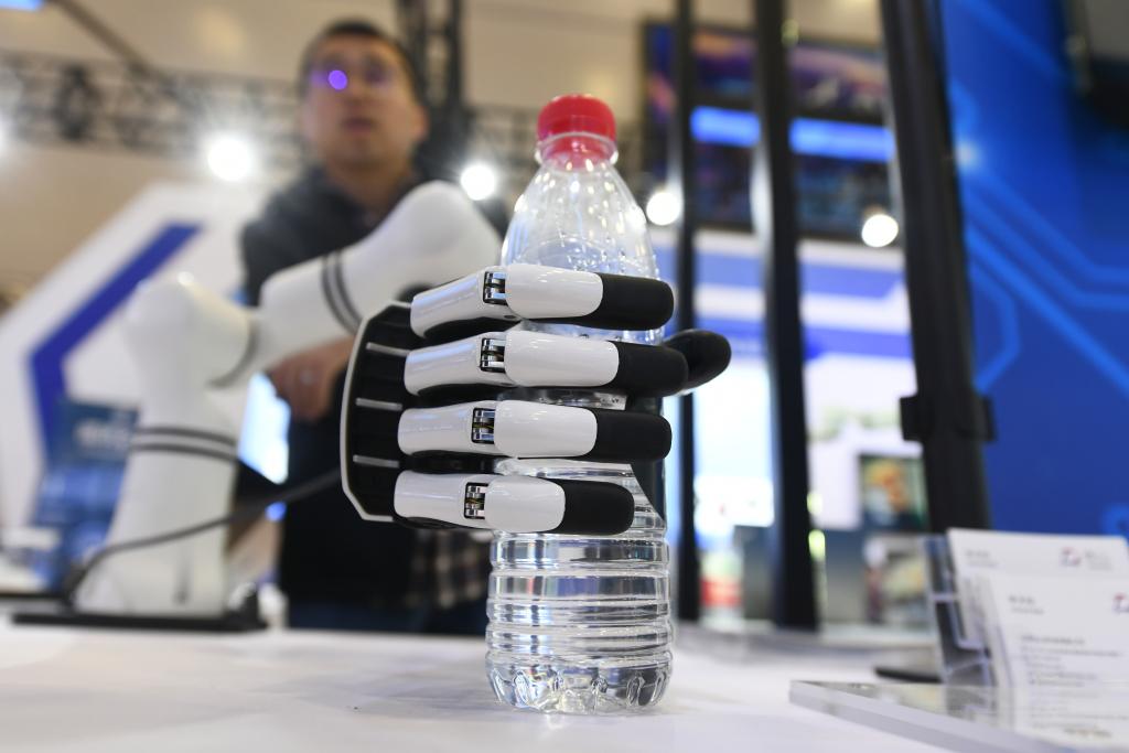 这是11月6日在第十二届中国(绵阳)科技城国际科技博览会上拍摄的机器人仿生手。新华社记者唐文豪 摄