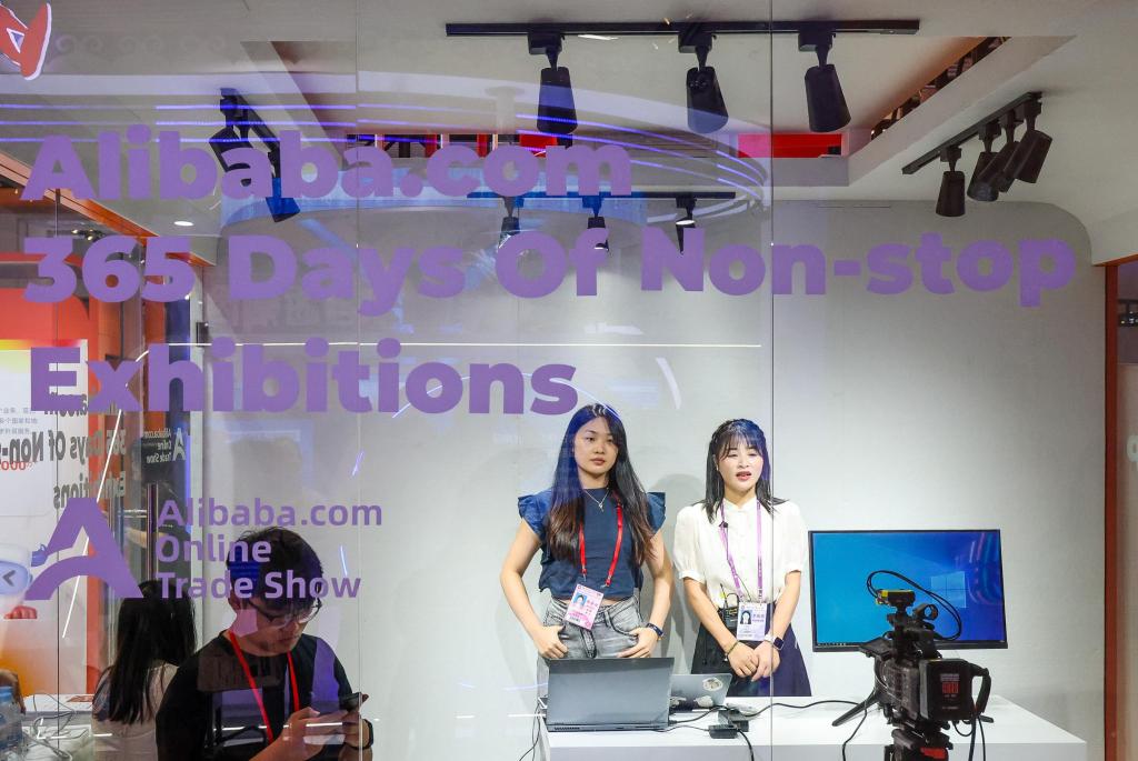 图为参展商在广交会上的阿里巴巴国际站展台直播(新华社记者刘大伟 摄)
