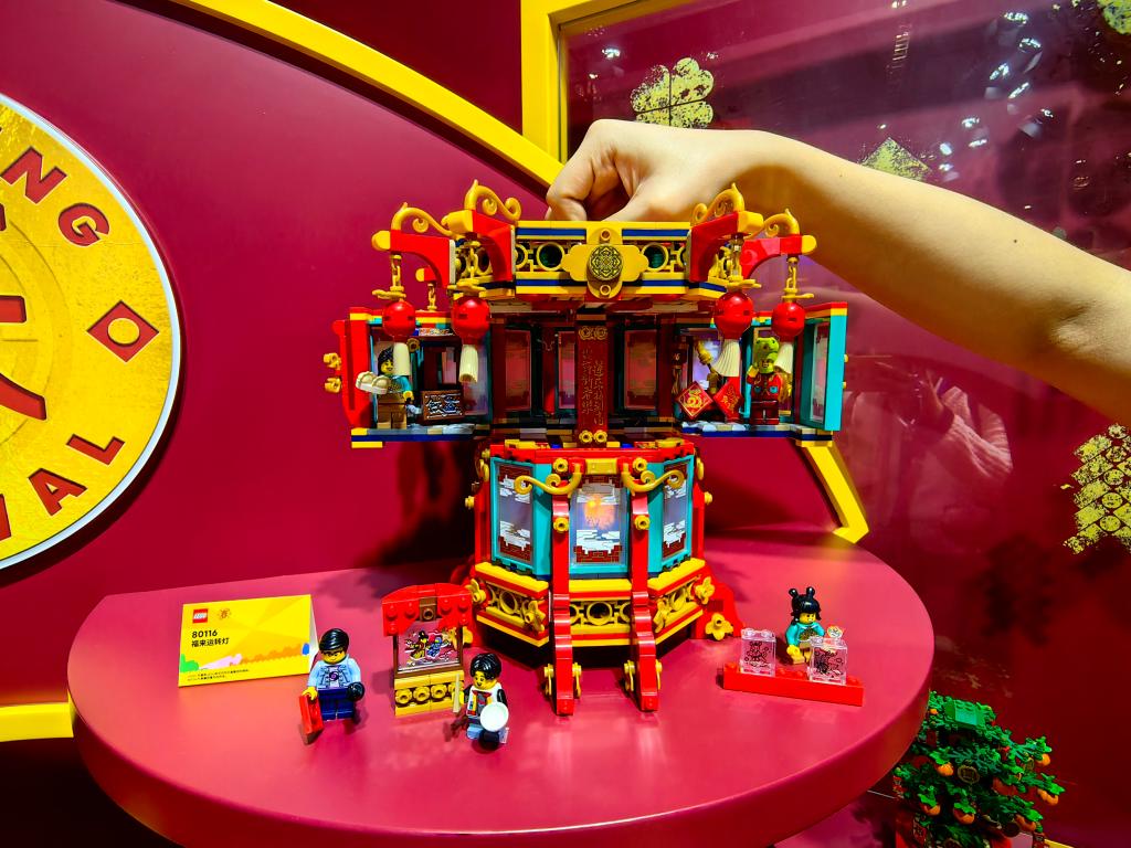 乐高集团全球首发的福来运转灯是消费品展区的“明星展品”,以中式福气花灯造型为灵感,装置的发光积木颗粒可以模拟出“跑马灯”,在灯笼中打造一场福鹿财神光影秀,营造“新春妙玩新年俗”的喜庆氛围。
