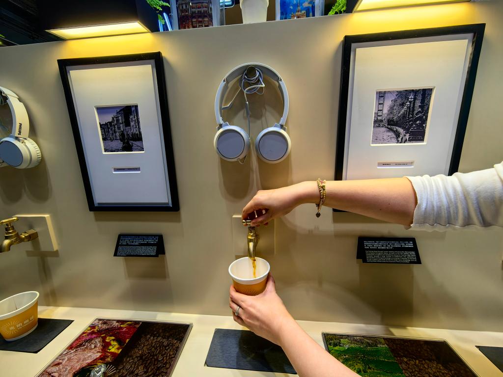 七个水龙头一字排开,轻轻一拧,七个国家咖啡豆做成的现磨咖啡便流淌而出,可以直接流入杯中。如果你有兴趣,还可以用手机扫码或是戴上现场的耳机,在喝咖啡的同时,配合着当地城市乐团的演绎,品味异国风情。