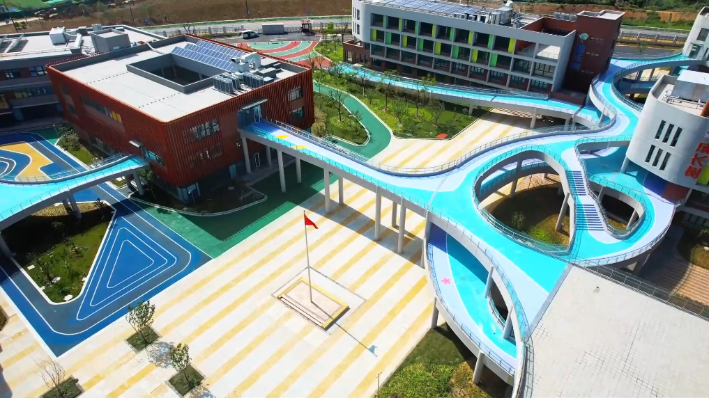 室外“彩虹坡道”,巧妙地将五栋大楼连接在了一起。既方便孩子们在院内各区域自由穿行,又能满足残疾儿童轮椅上下,真正实现了环境和空间的友好。