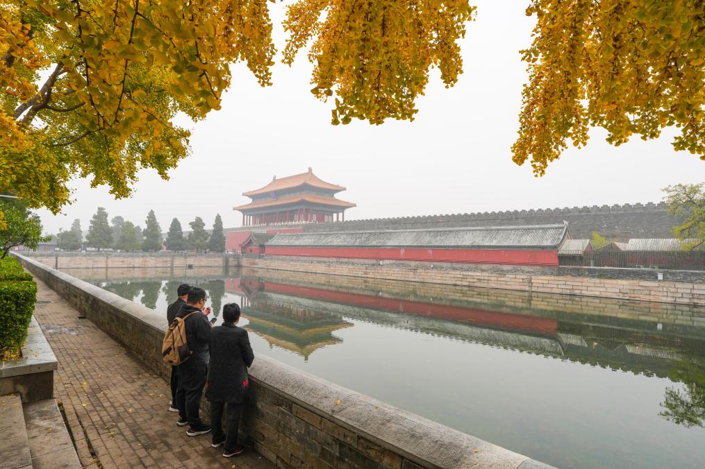 11月2日,游客在北京故宫神武门附近赏景。当日,北京出现大雾天气。新华社记者 陈晔华 摄