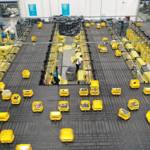 11月7日,浙江省湖州市德清县乾元镇第一产业智慧物流园区快鱼服饰有限公司华东物流中心,800余台分拣“小黄人”机器人在精准配送各类服饰(无人机照片)。新华社发(倪立芳摄)