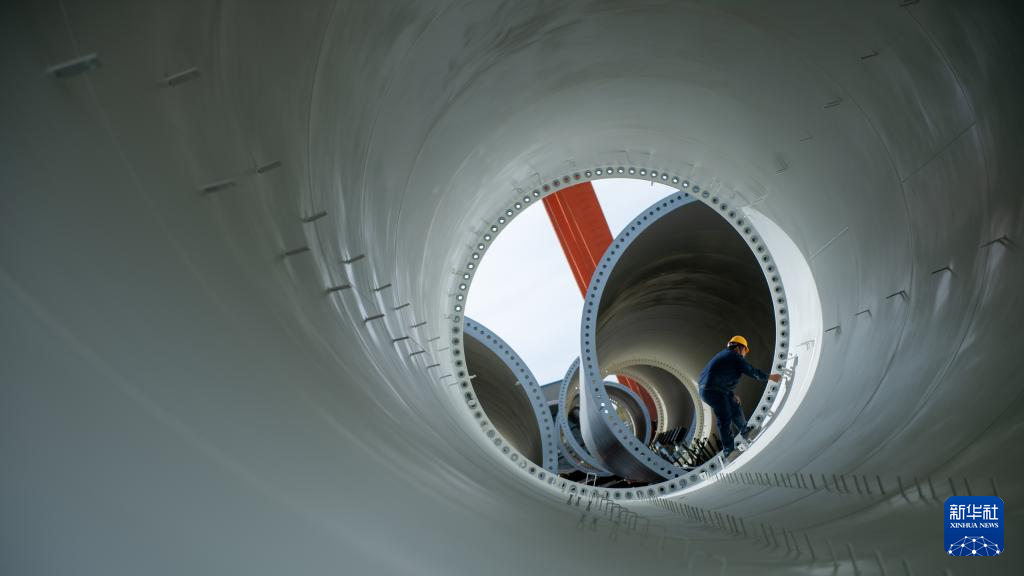 青海华汇新能源有限公司塔筒车间工人在检查塔筒(10月10日摄)。新华社发(潘彬彬 摄)