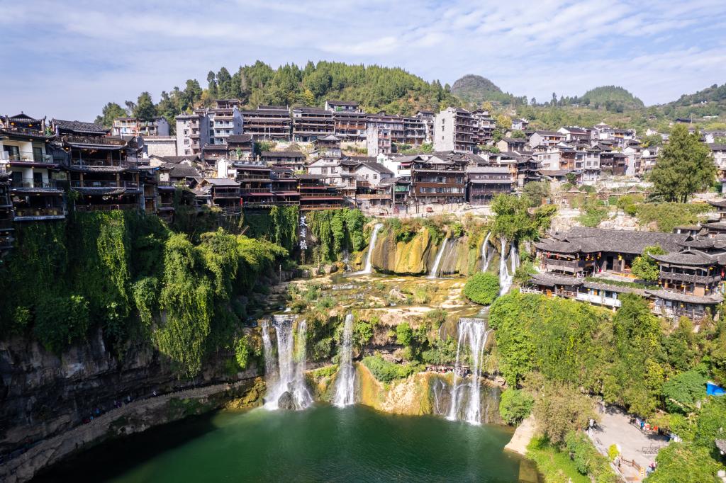 芙蓉镇位于湖南省湘西土家族苗族自治州永顺县,是一个拥有两千多年历史的古镇,因瀑布穿梭其中,气象宏伟,又被称为“挂在瀑布上的千年古镇”。
