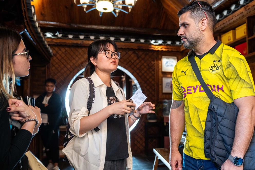 11月7日,在湘西永顺县芙蓉镇景区,张家界国旅国际旅行社的英语导游徐严(中)和外籍游客沟通。新华社记者 陈思汗 摄