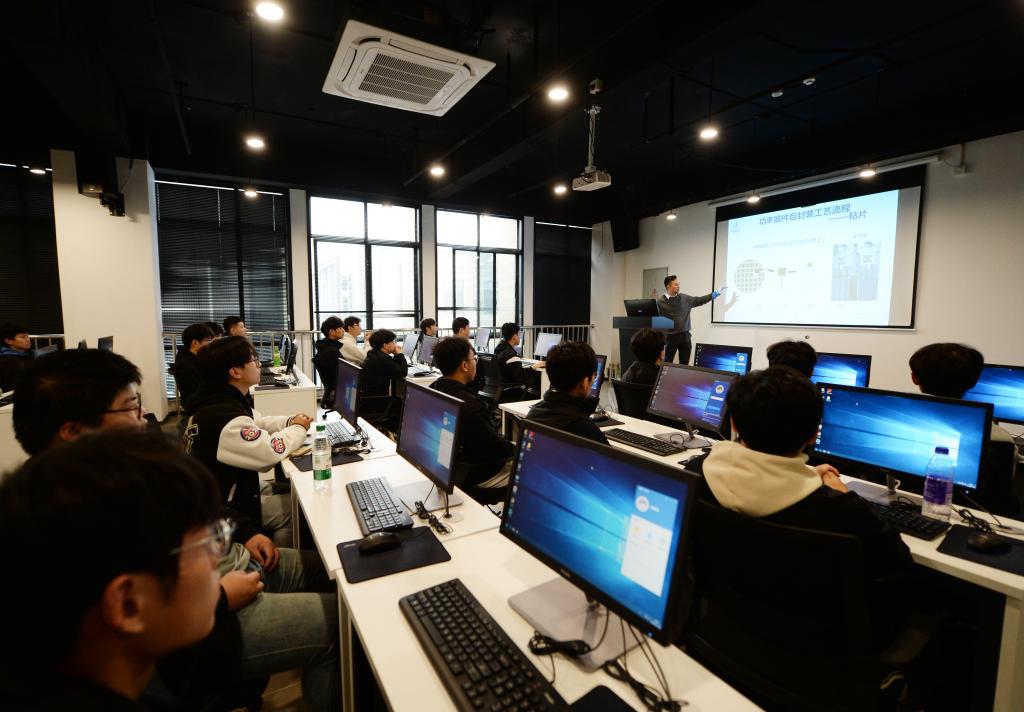 11月10日,在安徽池州人力资源服务产业园,园区半导体企业技术人员给当地高校学生讲解半导体产业相关知识。新华社记者 刘勇贞 摄