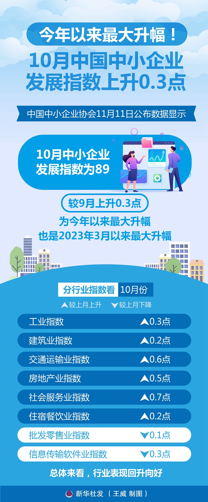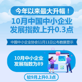 新华社北京11月11日电(记者王雨萧)中国中小企业协会11日公布数据显示,10月中小企业发展指数为89,较9月上升0.3点,为今年以来最大升幅,也是2023年3月以来最大升幅。其中,分项指数、分区域指数全面上升。