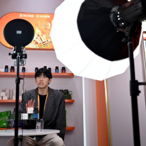 第七届进博会期间,快手跨境主播在服务贸易展区直播。新华社发(陈浩明 摄)