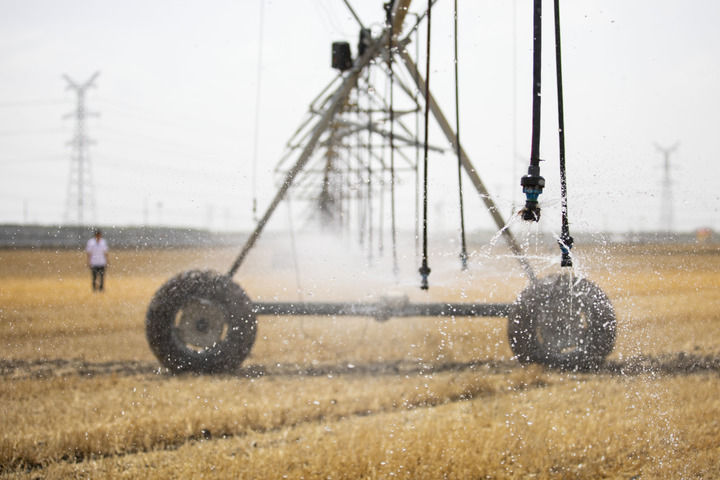 2024年6月24日,在山东省东营市广饶县李鹊镇一家庭农场,农民用桁架式喷灌机为玉米地浇水。新华社发(刘云杰摄)