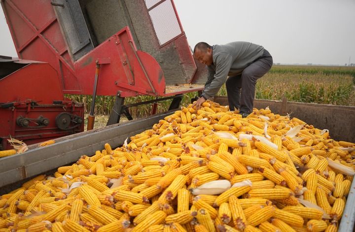 2024年10月9日,在山东省临邑县德平镇,农户把收获的玉米装车运输。新华社记者 徐速绘 摄