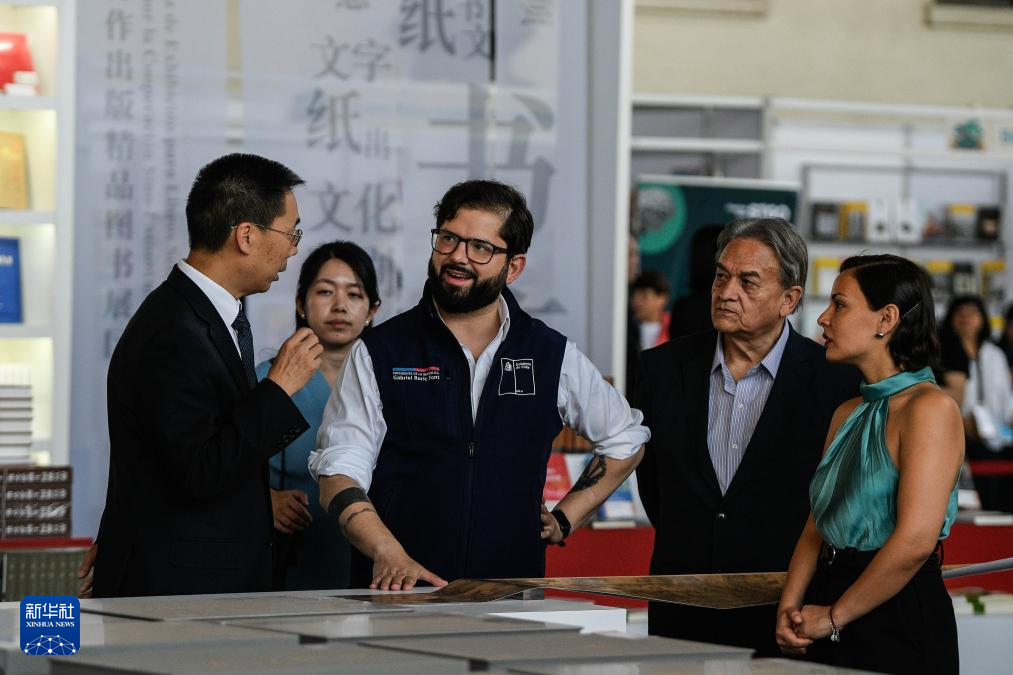 11月13日,智利总统博里奇(左二)在首都圣地亚哥参观第43届圣地亚哥国际书展中国主宾国展区。新华社发(豪尔赫·比列加斯摄)