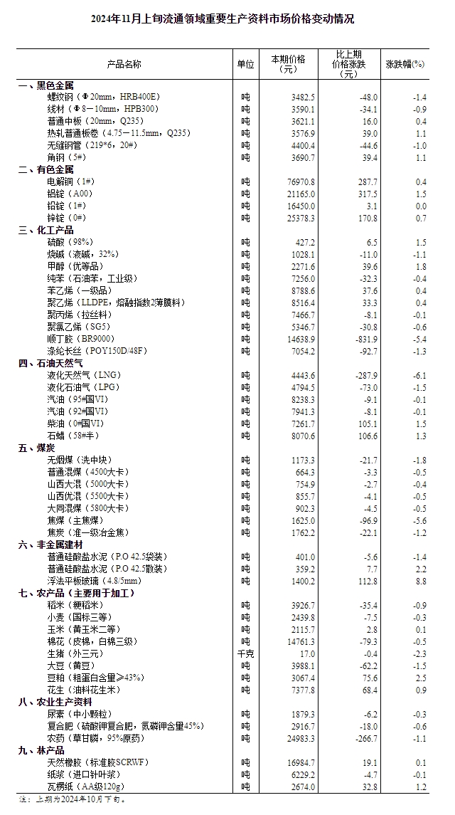 据国家统计局网站消息,国家统计局14日发布2024年11月上旬流通领域重要生产资料市场价格变动情况。