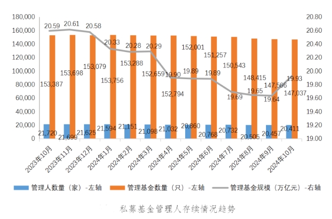 截至2024年10月末,存续私募基金147037只,存续基金规模19.93万亿元。其中,存续私募证券投资基金90853只,存续规模5.26万亿元;存续私募股权投资基金30456只,存续规模10.93万亿元;存续创业投资基金24803只,存续规模3.34万亿元。(记者刘羽佳)