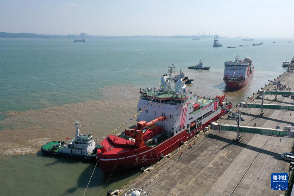 11月1日,“雪龙”号和“雪龙2”号船从广州南沙国际邮轮母港码头出发(无人机照片)。