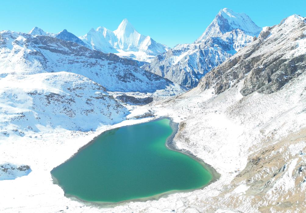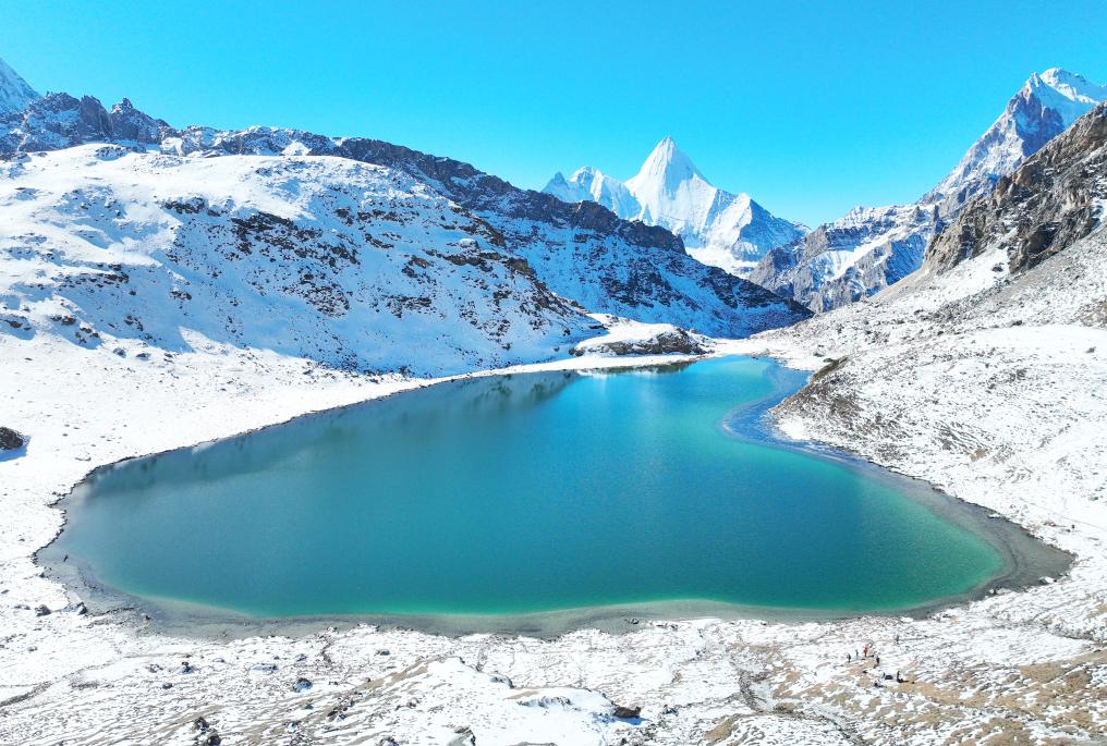 初冬时节,四川省甘孜藏族自治州稻城亚丁景区的“牛奶海”呈现出清澈的蓝色,湖水四周被洁白的雪山和冰川环绕,宁静而壮美,吸引各地游客前来打卡拍照。