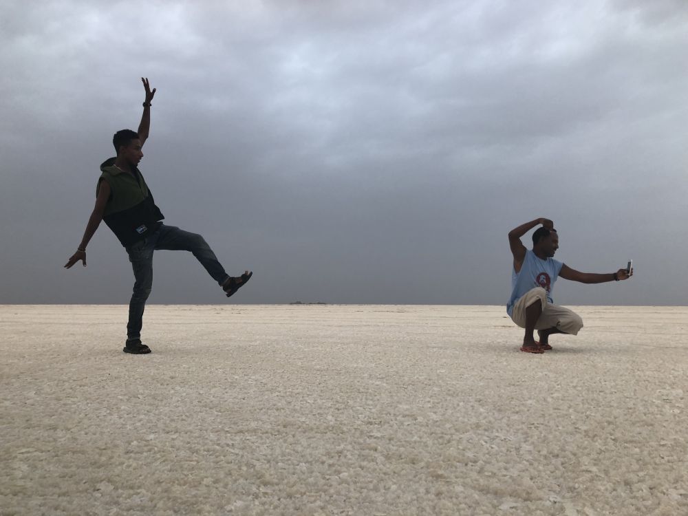 在阿萨勒盐湖边搞怪自拍的年轻司机塔梅(右)。