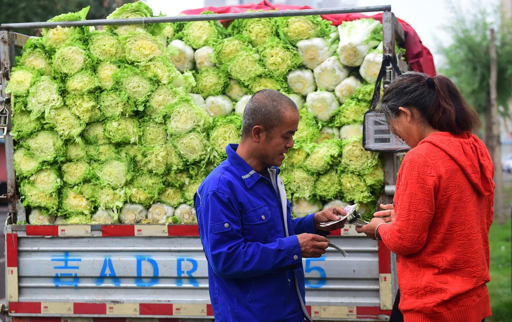 2016年10月3日,在吉林长春民丰大街农产品批发市场,菜农(左)在售卖大白菜。
