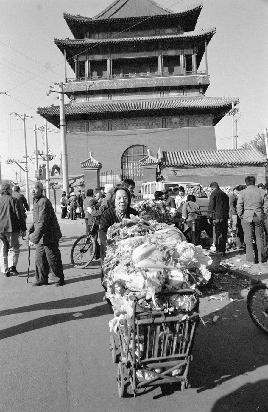 1988年11月,北京街头一位女士用婴儿车运送白菜。