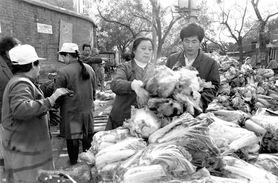 1994年10月31日,北京市西城区的居民们在菜站购买冬储大白菜。