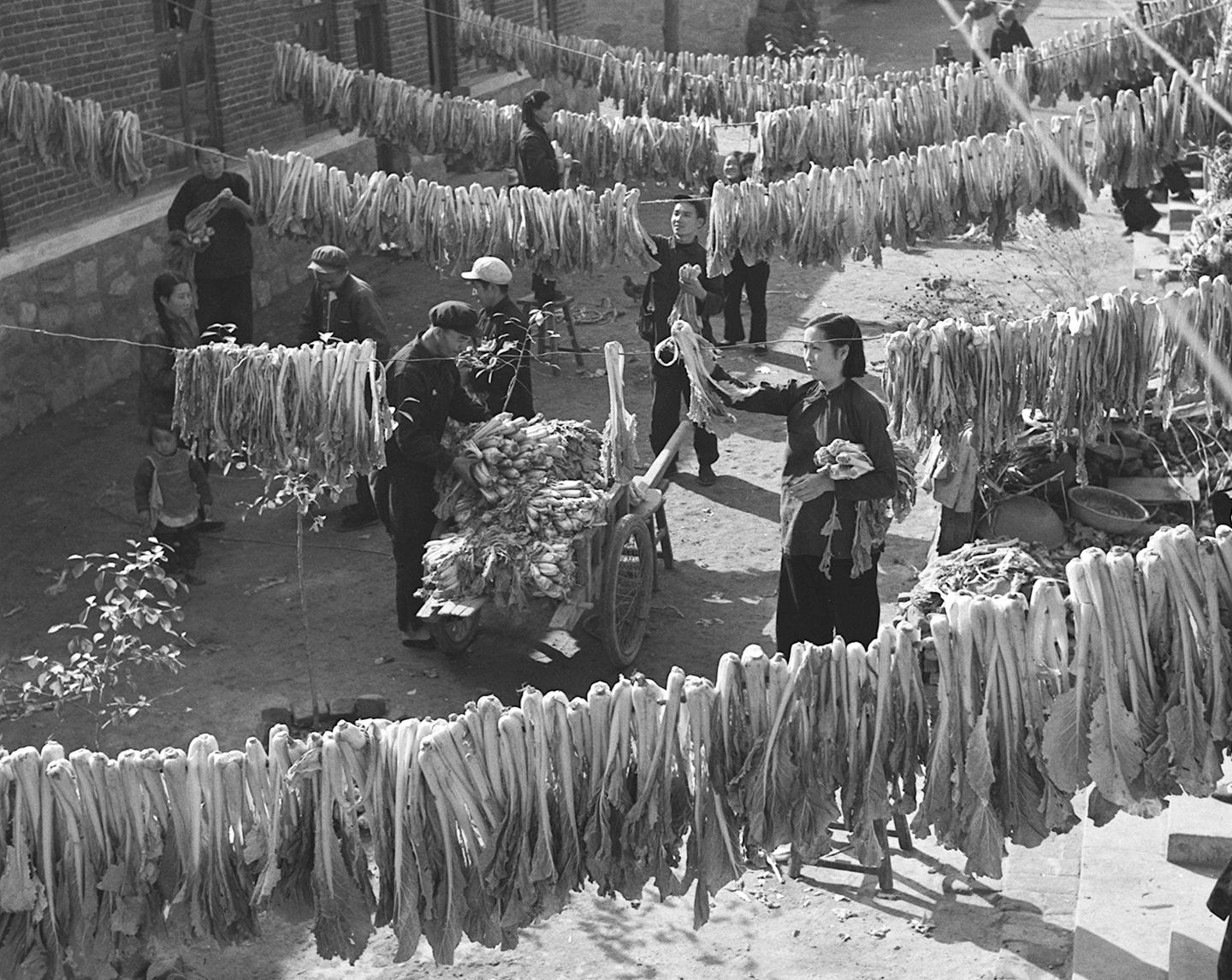 1963年11月,北京二龙路分菜站职工在加工晾晒的大白菜,准备入窖。