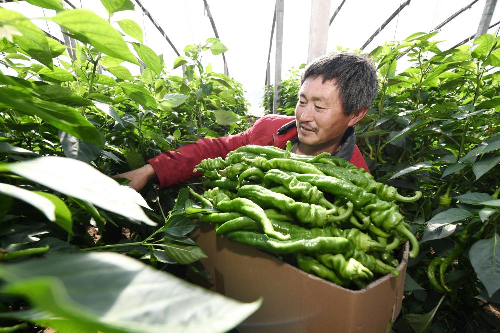 2018年12月9日,河北乐亭胡家坨镇一个果蔬专业合作社的社员在大棚内采摘辣椒。