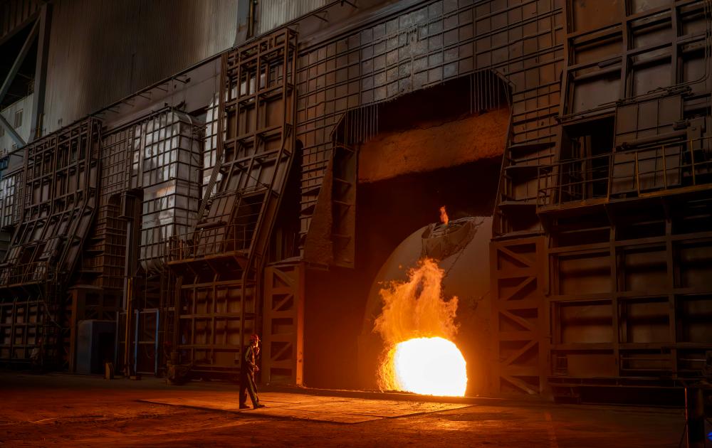 11月12日,在炼钢厂炼钢作业区,工作人员在查看转炉内部溅渣情况。