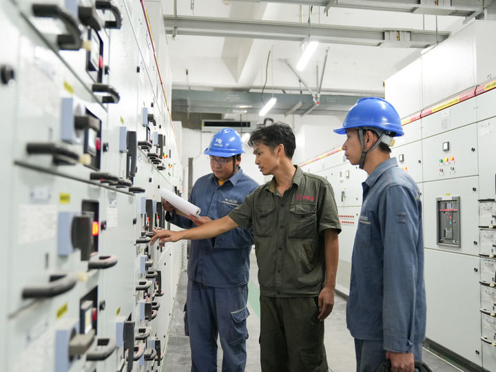 9月6日,南方电网广西北海供电局工作人员在北海市人民医院银滩分院检查配电房设施,沟通防护措施。(阳文志 摄)