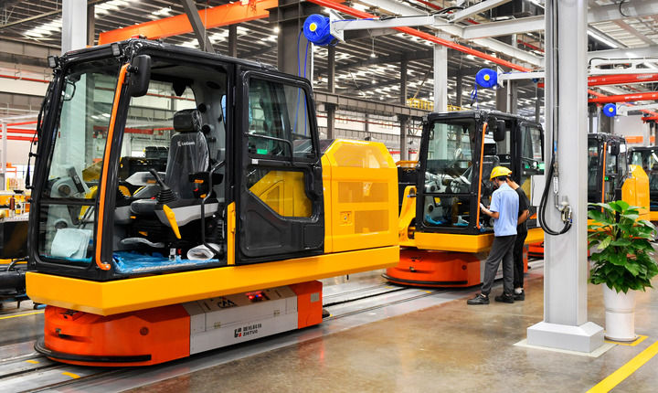 在广西柳州市柳工挖掘机智慧工厂拍摄的有轨制导车辆装配线(5月10日摄)。新华社记者 金皓原 摄