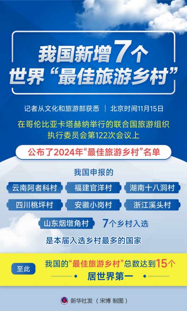 新华社北京11月15日电(记者徐壮)记者从文化和旅游部获悉,北京时间11月15日,在哥伦比亚卡塔赫纳举行的联合国旅游组织执行委员会第122次会议上,公布了2024年“最佳旅游乡村”名单,我国申报的云南阿者科村、福建官洋村、湖南十八洞村、四川桃坪村、安徽小岗村、浙江溪头村、山东烟墩角村7个乡村入选,是本届入选乡村最多的国家。