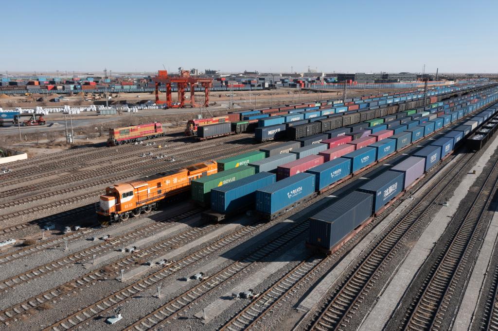 中欧班列在二连浩特铁路口岸换装场整装待发。(中国铁路呼和浩特局集团有限公司供图)