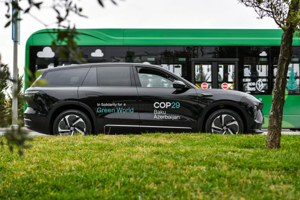 这是11月11日在阿塞拜疆首都巴库拍摄的为参会者提供服务的中国品牌电动车。新华社记者曹阳摄