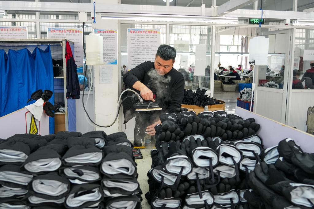 小雪节气临近,山东济宁嘉祥县的新高地创新智慧产业园里,一片片布料经过缝纫、熨烫、充绒、质检等流程,变成一双双滑雪手套。在打包装箱后,它们即将销往远方。