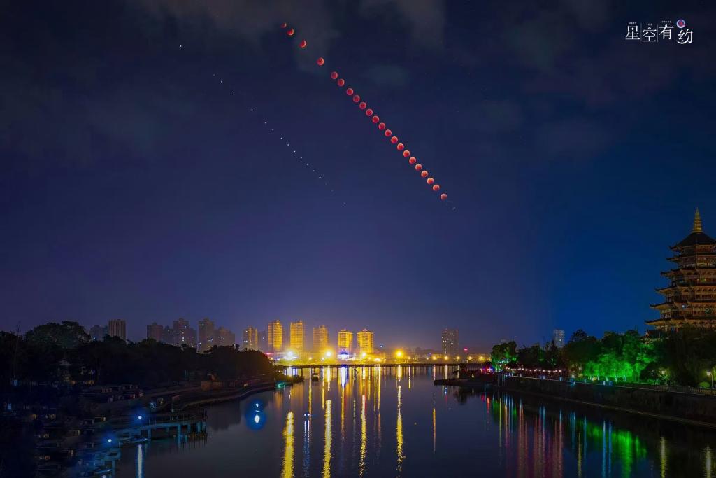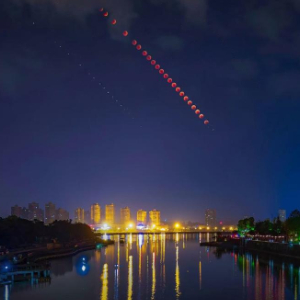 2018年7月28日,月全食与火星“同框”。这是当晚在四川省遂宁市九莲洲生态湿地公园拍摄的月食“项链”与火星“项链”(多张叠加)。(蒋涛摄)