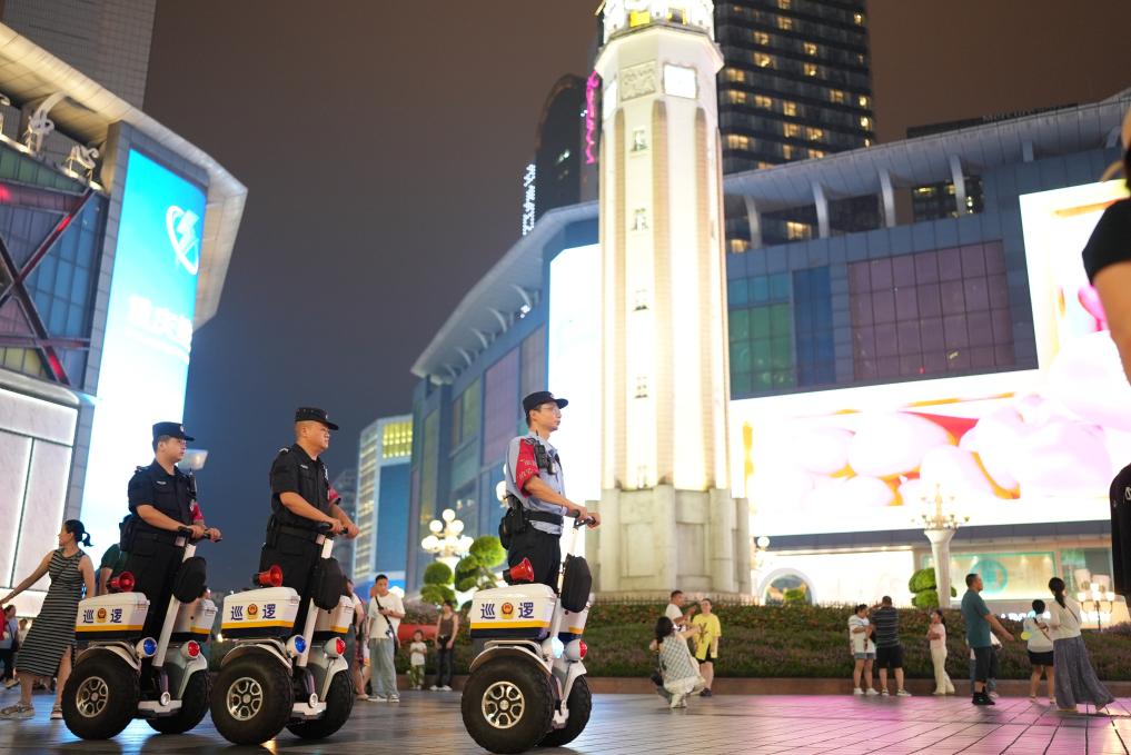 重庆市渝中区公安分局解放碑街面警务站民警正在巡逻。(张博 摄)