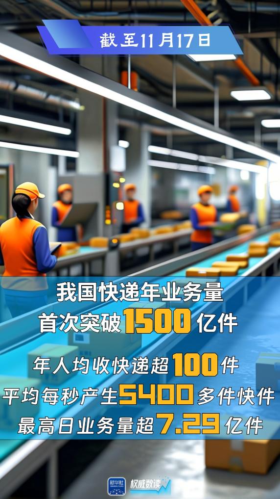 国家邮政局监测数据显示,截至11月17日,我国快递年业务量首次突破1500亿件。今年以来,我国快递市场保持繁荣活跃,发展质效不断提升,加快推进产业升级、拉动生产消费,为更好提高经济运行效率、畅通实体经济循环作出重要贡献。